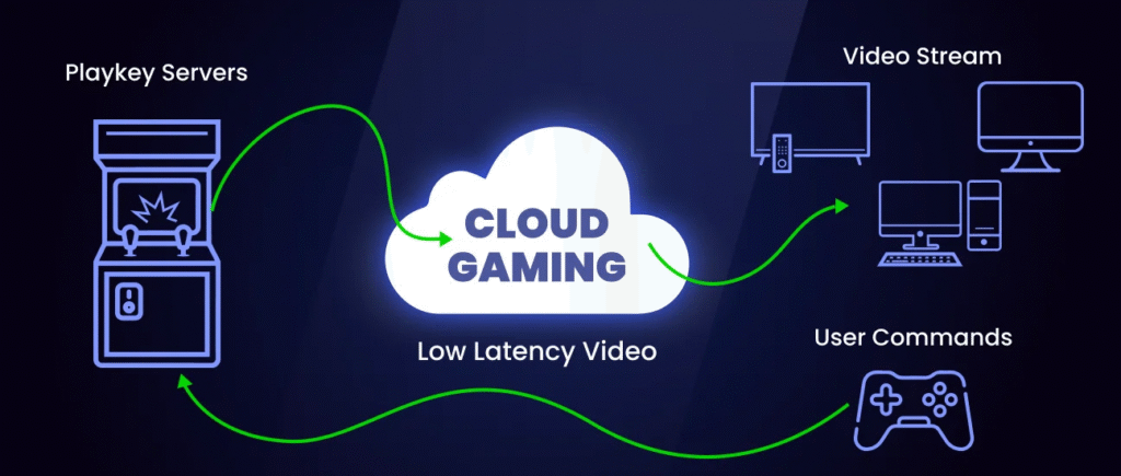 Cloud gaming allows you to play games streamed from powerful remote servers instead of running them on your own device. Your device becomes a screen and controller, while the heavy processing happens in the cloud—similar to how Netflix streams movies.